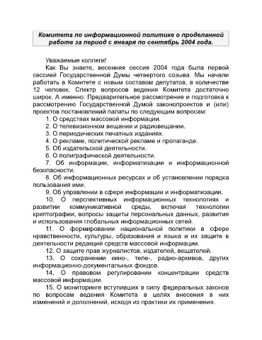 Комитета по информационной политике о проделанной